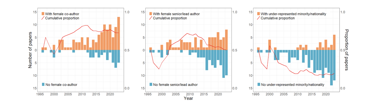 It’s easy to pay lip-service to diversity and inclusion initiatives, and harder to provide evidence of support for women and minorities in science. One directly supportive action is through collaboration and joint publication. This shouldn’t really be an issue because many of the best senior scientists and the most promising junior scientists are women. Nonetheless, stereotypes and prejudices get in the way. Many male scientists publish primarily with other men – the so-called “Daversity problem” – and are less likely to collaborate on studies led or coordinated by women. The figure below shows that three-quarters of my publications are co-authored with women and around half have women as their lead or senior author. On the other hand, I have published much fewer papers (one-fifth) with researchers from the Global South or developing nations, partly because they are under-represented at all levels of academia. This is an imbalance I am actively working to address.